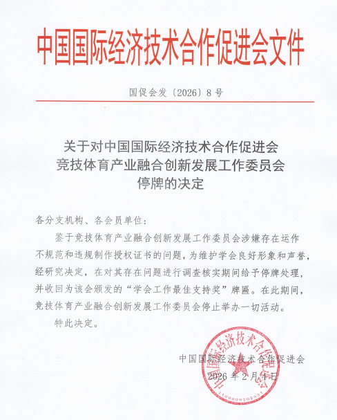 关于对中国国际经济技术合作促进会竞技体育产业融合创新发展工作委员会停牌的决定