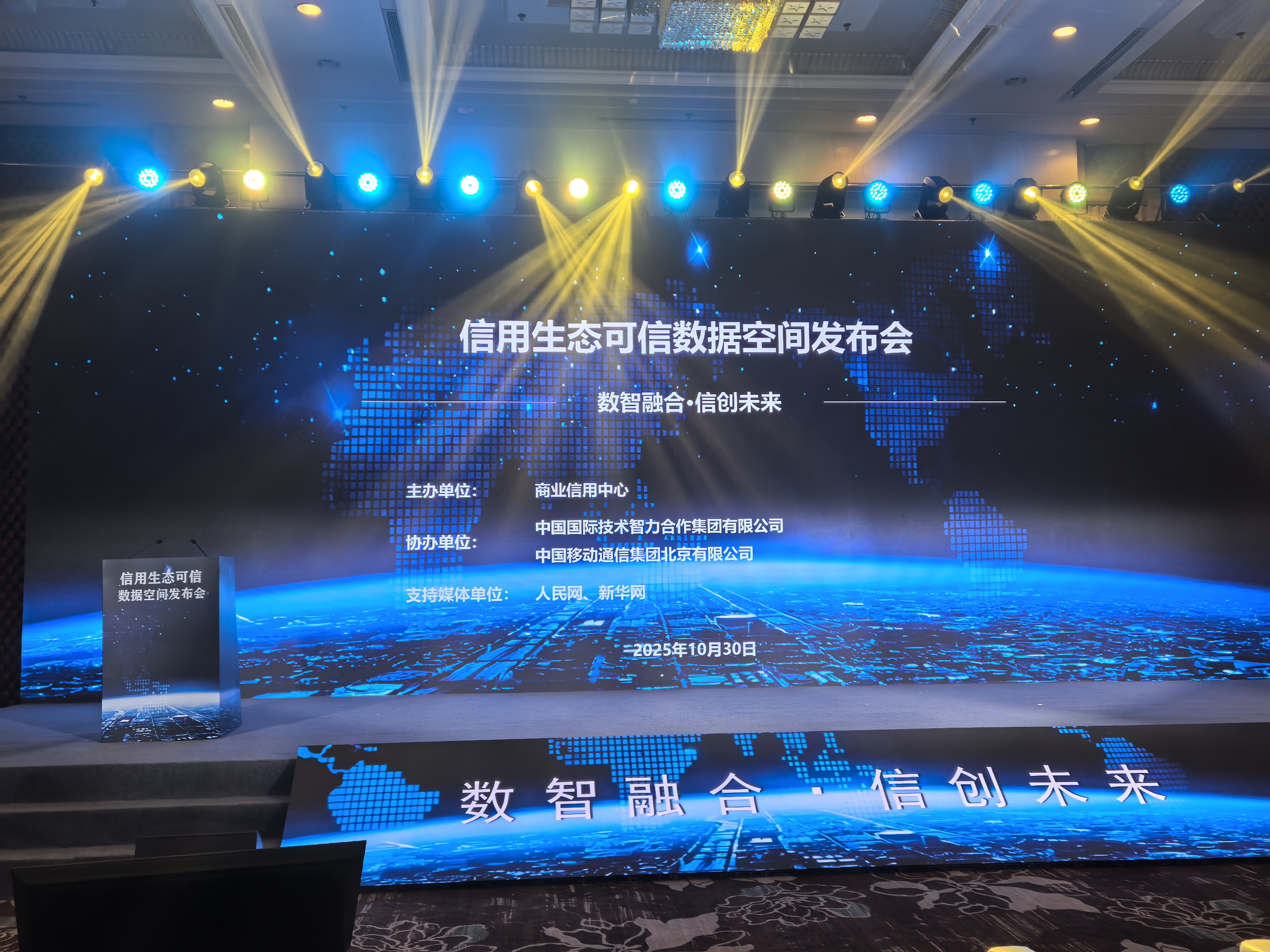 10月30日上午,受杨春光理事长委托,杨连子副理事长带领有关人员参加了由商业信用中心主办,中国国际技术智力合作集团有限公司、中国移动通信集团北京有限公司协办的以“数智融合 信创未来”为主题的信用生态可信数据空间发布会。